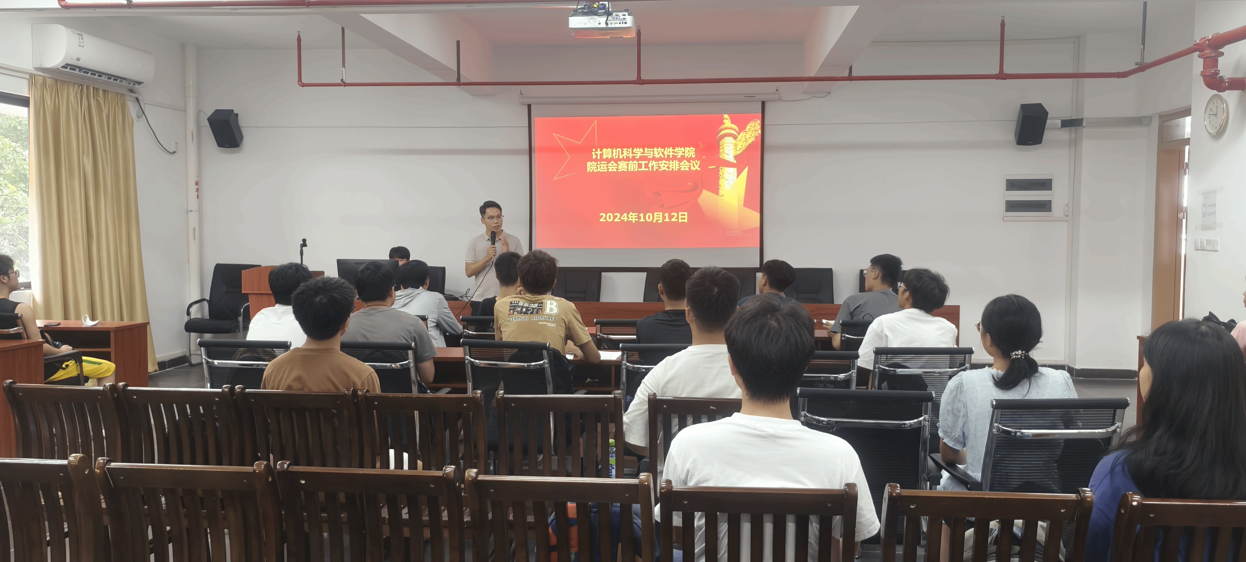 在即将到来的院运会前夕,公司于2024年10月12日中午12:40分在实训大楼315召开了赛前工作安排会议,旨在确保赛事的顺利进行。梁燕龙老师、各班班长及体育委员出席本次会议,共同商讨并明确了赛前的各项准备工作。