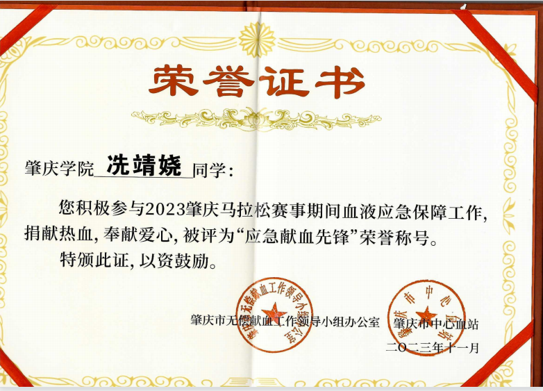 在2023年肇庆马拉松赛事期间血液应急保障工作中,公司共有8名学子获得“应急献血”荣誉称号。