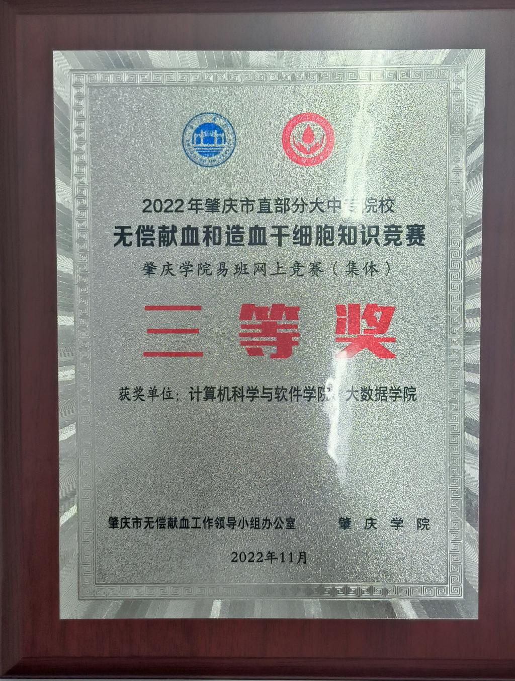 公司积极响应该活动,大力引导员工参加活动,做好相关宣传,通过公司全体员工的努力下,喜获得2022年肇庆市直部分大中专院校无偿献血和造血干细胞知识竞赛伟德国际victor1946易班网上竞赛三等奖。
